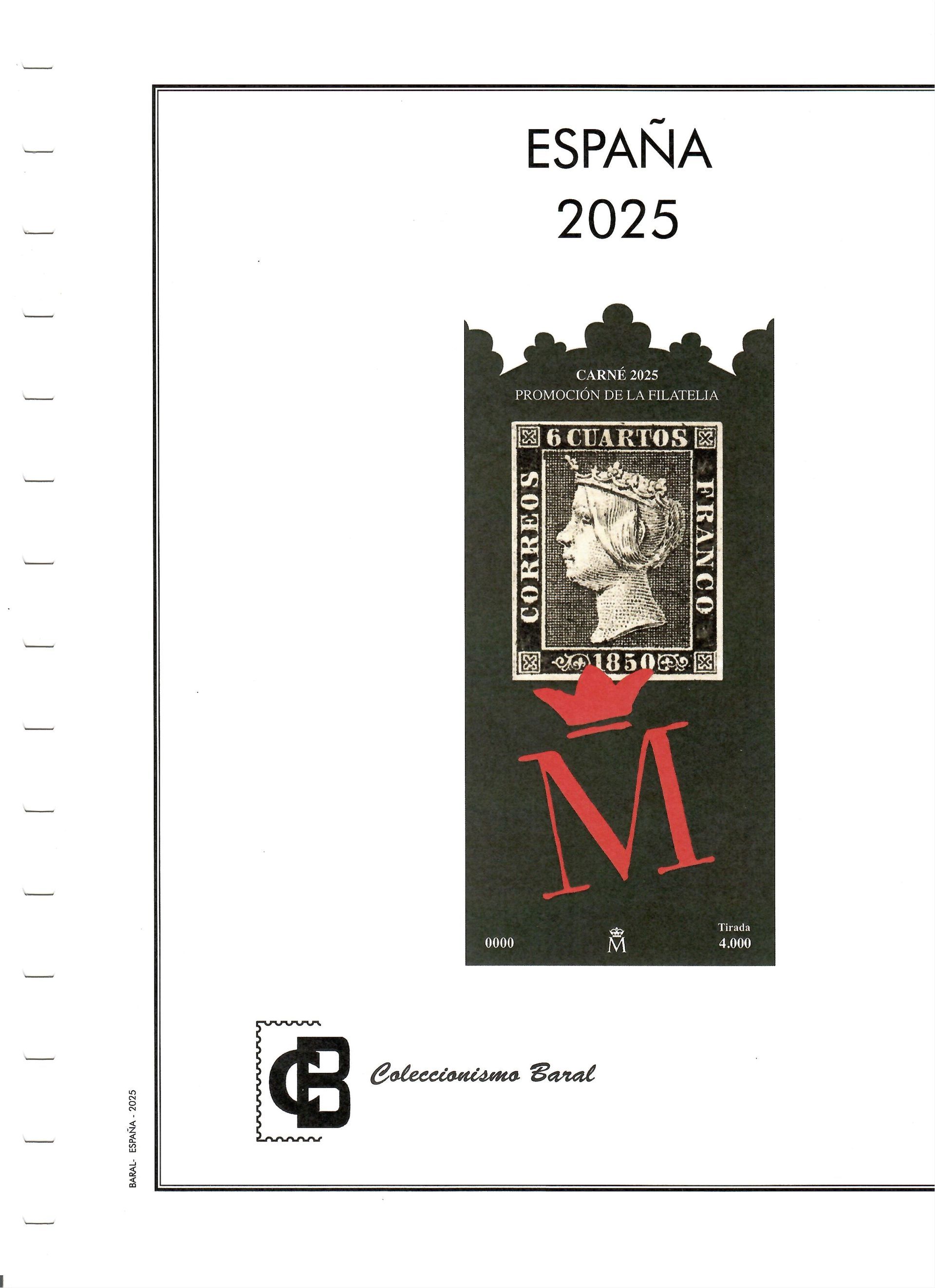 Hojas de 15 anillas (tamaño standard) para colocar los sellos y hojas bloque de España 2025, incluye hoja para Homenaje filatélico y para Carnet promoción filatelia - con estuches transparentes o fondo negro
